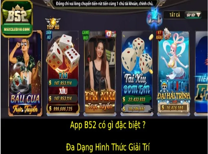 Không chỉ dừng lại ở tính năng xuất sắc, ứng dụng B52 còn chinh phục người dùng bằng một kho nội dung giải trí đa dạng và phong phú. Từ những trò chơi hấp dẫn đến các chương trình giải trí đặc sắc, B52 luôn có thứ gì đó để đáp ứng mọi nhu cầu của người dùng.
